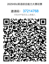 2.报名方式:请选手们于5月11日中午12:00前点击链接填写报名表,报名网址:https://www.wjx.cn/vm/ryxKamv.aspx#。报名成功后请及时加入学习通“2025HDU英语综合能力大赛”(邀请码见下图),以便及时接收大赛相关信息。